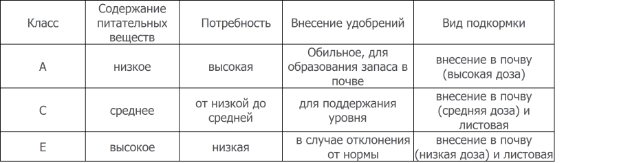 Если по причине погодных условий поступление микроэлементов через почву ограничено, листовая подкормка может временно компенсировать дефицит питательных веществ. В тех случаях, когда по результатам исследований содержание питательных веществ относится к классу С и Е, а внесение почвенных удобрений невозможно, необходима листовая подкормка. Так как листовая подкормка проводится только после появления достаточной листовой массы, а также при проявлении симптомов дефицита, внесение всей дозы в почву может быть более эффективным.