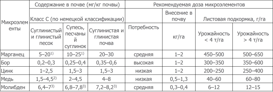 Табл. 1: Оптимальное почвенное содержание и дозы внесения микроэлементов для рапса