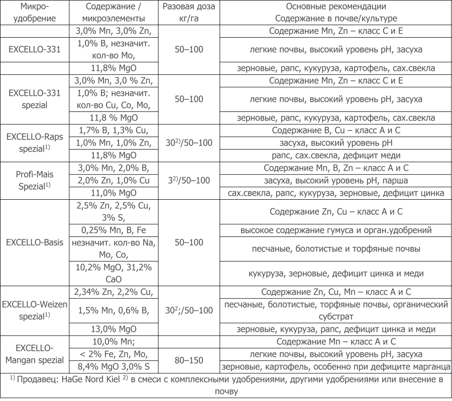 Комбинированные удобрения, например, Excello-331 с марганцем, цинком и бором или Excello-331 spezial, с дополнительным содержанием меди, надежно зарекомендовали себя на почвах среднего и выше среднего качества. Для обеспечения потребности рапса в меди на легких почвах очень эффективен препарат Excello-Raps spezial. Его использование стало особенно актуальным в последние годы, поскольку дефицит меди все чаще обнаруживается на делювиальных, песчаных почвах. Благодаря высокому содержанию бора (2%) препарат Profi-Mais spezial одинаково хорошо подходит как для рапса, так и для сахарной свеклы.